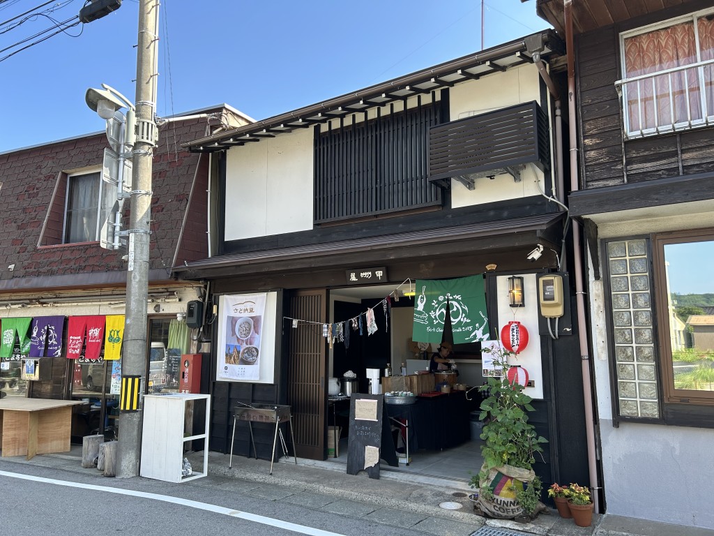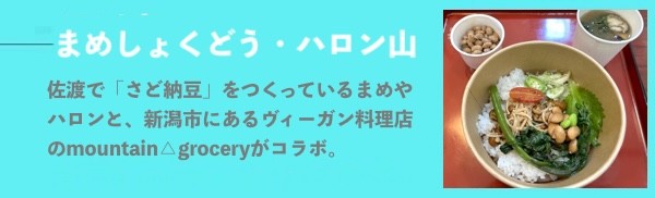 イエローエリアの小木商店街にあったのが、アース・セレブレーションの期間中のみ出店するというまめしょくどう・ハロン山。佐渡で「さど納豆」をつくっているまめやハロンと新潟市にあるヴィーガン料理店のmountain△groceryがコラボして食堂として店を開いている。ハーバーマーケットではなく、古民家を借りて営業しているのは、暑さから食材と自分の身体を保護するためだとmountain△groceryのyoyoさんは話してくれた。そういえば、アウトドアブランドのチャムスも、古民家を借りてポップアップストアとして出店していた。空き家になっている家も多そうだし、この歴史のある建物を、飲食に限らず物販やイベントスペースに活用していくのも今後の展開としてはいいかもしれない。