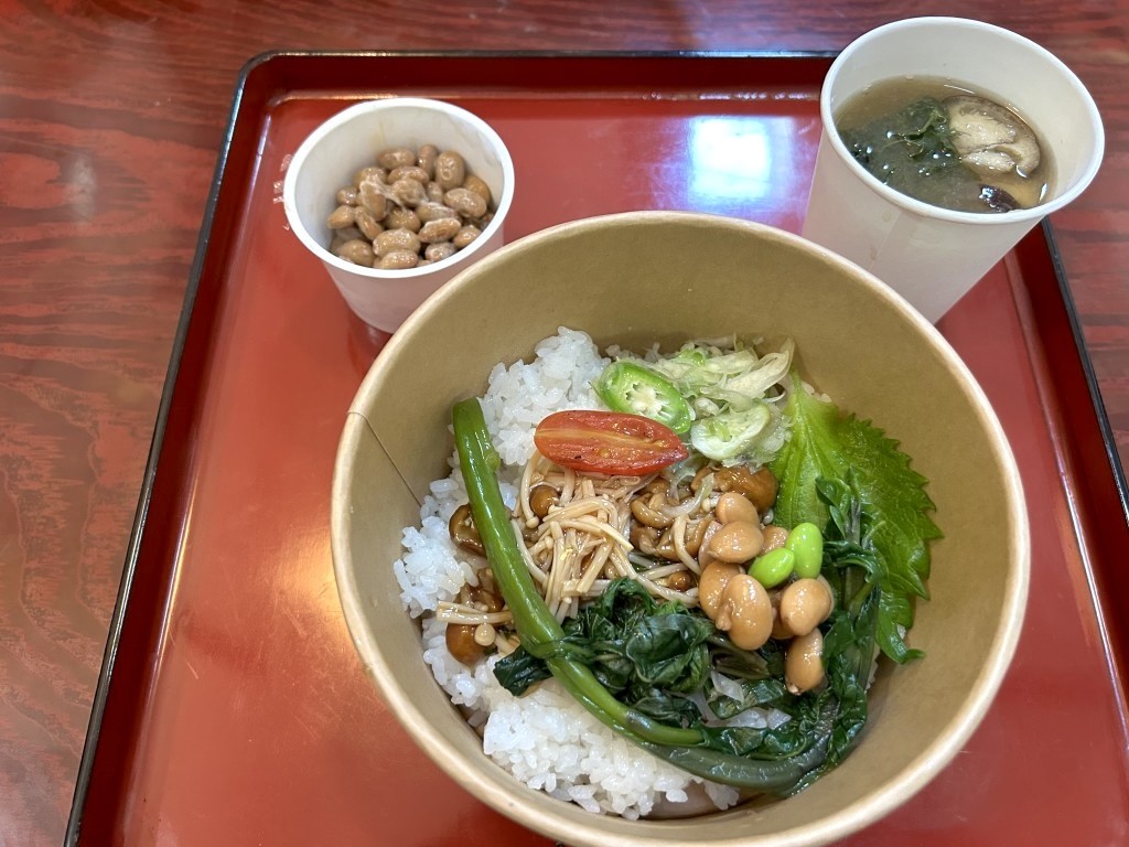 「さど納豆」は佐渡でつくられた豆を使っているという。小粒ではなく中粒程度の大きさ。納豆になっても、しっかりと豆の味がする。丼に入っていたのはツルムラサキ、紫蘇、なめ茸など。豆は煮豆。これだけでも美味しいのだけど、途中で納豆を追加して味変。味噌汁も佐渡のわかめを使うなど、「日本人でよかった」と納得してしまう朝食になった。昼には魚の炭火焼き定食も用意されていたから、来年はこの昼食もチェックしなきゃ。