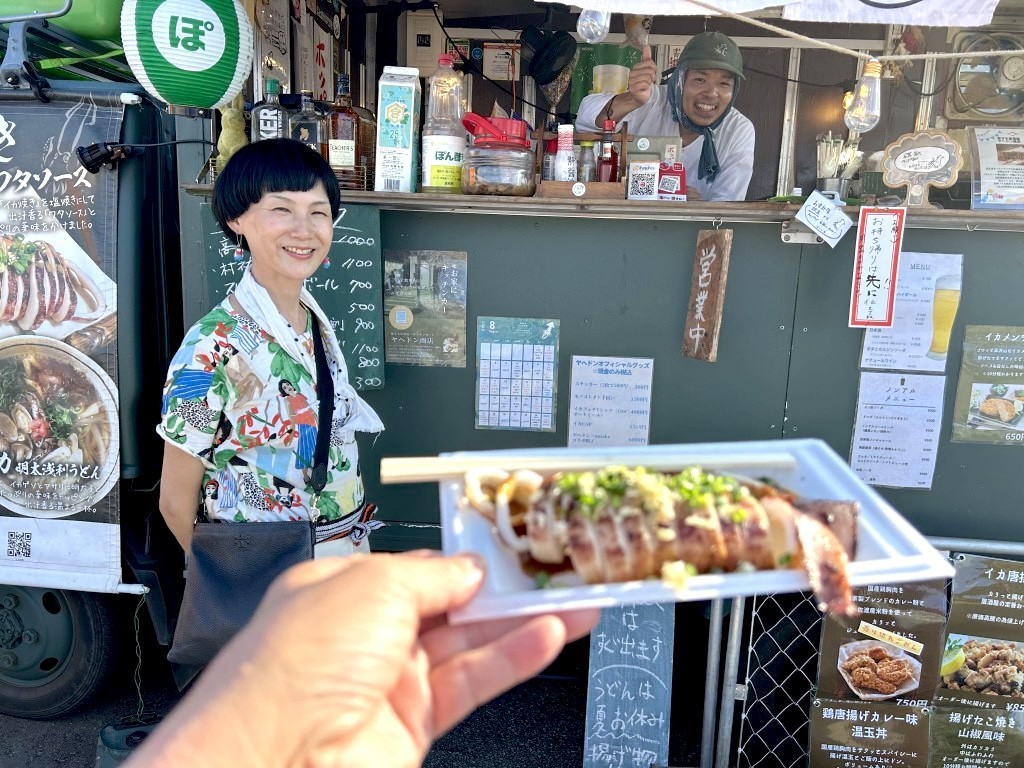 このヤヘドン商店ほど、イカにこだわったメニューが並んでいるフェス飯を見たことがなかった。イカガパオライス、イカ明太浅利うどん、イカ唐揚げ、イカリングフライ、イカメンチ……。街の居酒屋だって、こんなにイカのメニューが並ぶお店は少ないだろう。いくつもあるイカメニューのなかから選んだのが、イカ料理の王道中の王道と言っていいイカ焼き。