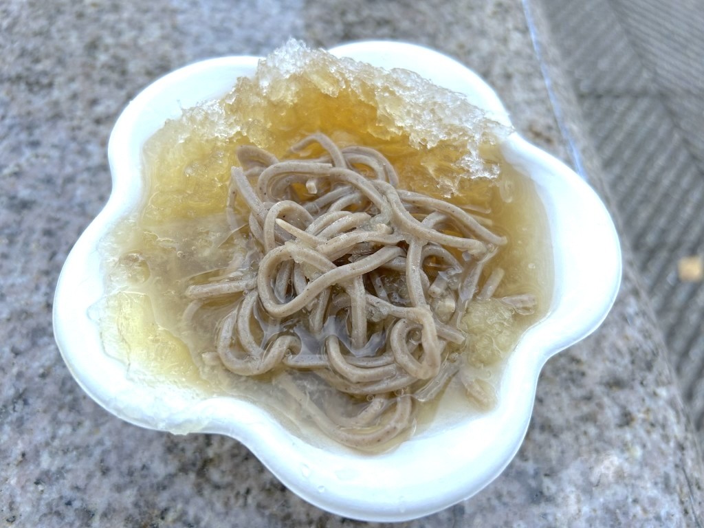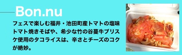 越前そばは大根おろしが使われていることが特徴だ。出汁で味付けされた氷が、福井永平寺産の蕎麦粉を使用した蕎麦と大根おろしの上に乗っている。やや太めの十割蕎麦は、喉越しを楽しむというよりもしっかり噛んで食べるタイプ。ただこれがフェス飯には合っているように思う。冷たくてサッパリ食べられる氷蕎麦は、今年の夏に出会ったいちばんのアイデアメニューでもあった。