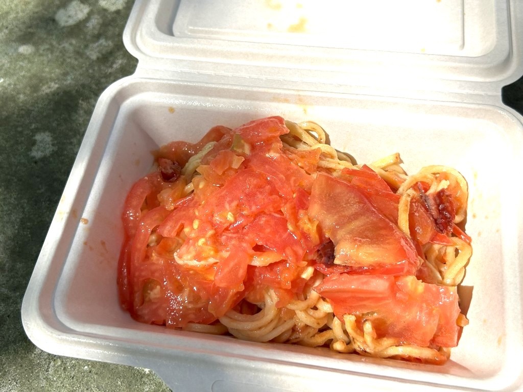 とにかくトマトがふんだんに使われている。写真を見ただけでオーダーしたので、口に入れたときに、いい意味での裏切られた感覚があった。勝手に冷静パスタをイメージしていたのだけど、トマトも麺もあたたかい。これは冷静パスタではなく塩焼きそば。トマトに熱が入れられていることで、さらに甘味が増し、酸味も感じられた。このトマトは福井県池田町で生産されているものだ。けっこうボリュームもあったけれど、サラリと完食。