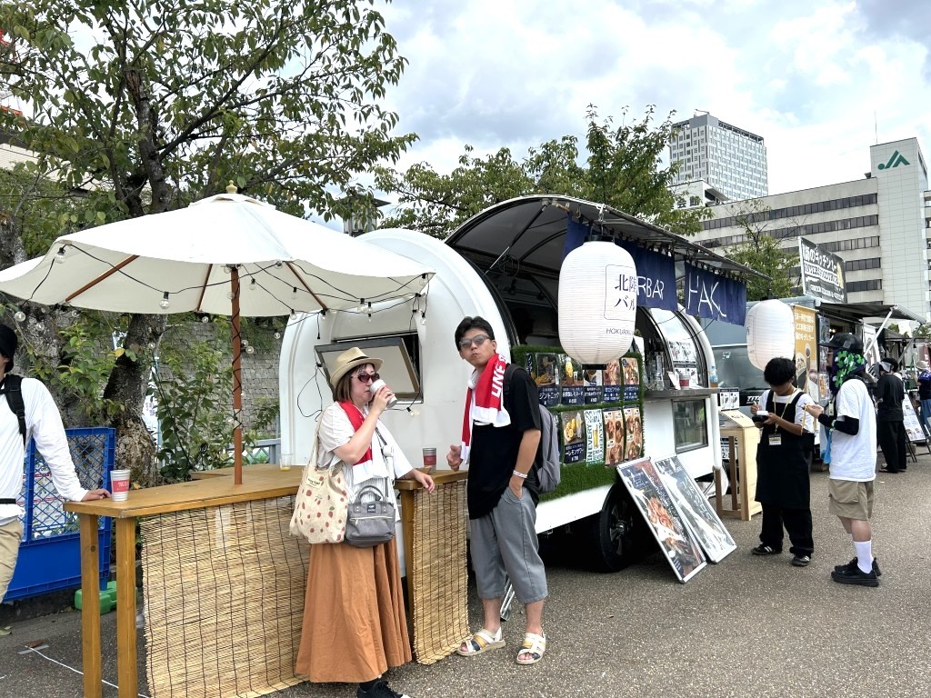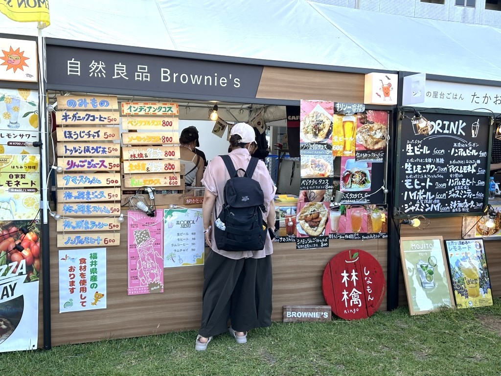 フードエリアは3つ。有料エリアにあるHONMARU FOOD COURTは、おそらく福井や北陸からの出店が中心。無料エリアのYONKSはコラボメニューが展開されていた。無料エリアのもうひとつのRAKUZAはケータリングカーでの出店で、そのケータリングカーは日本のいろんな地域から集まってきていたらしい。それぞれが個性を持ったフードエリアが展開されていた。出店数も多く、はじめて目にするメニューも多い。どれを食べようか、かなり迷うことになったONE PARKのフェス飯だった。