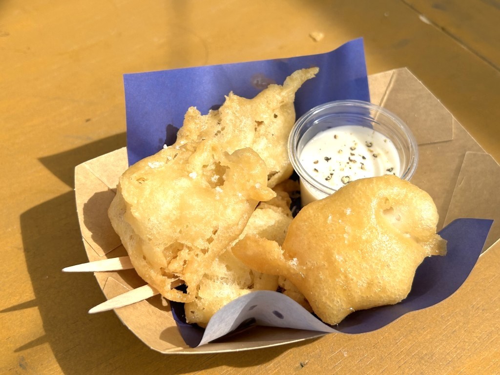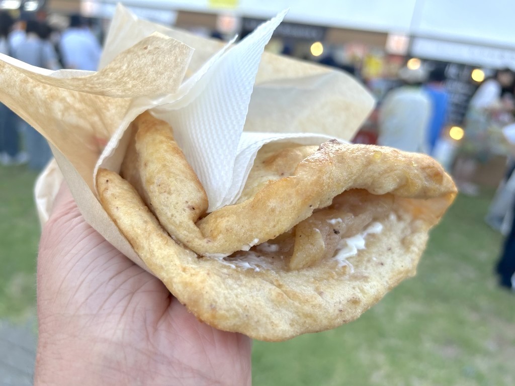フジロックのフジミシュランで5つ星をとったNATIVE AMERICANのお婆ちゃんに教わったフライブレッドだという。イメージするタコスとはまったくちがっていて、ボリュームもかなりある。揚げたてのフライブレッドに、シナモンで煮込まれたりんごがマッチしている。甘さは控えめ。りんごは長野の低農薬で育てられたものだと記載されていた。間食として食べたけど、朝イチのメニューとしてもいいだろうし、ビールとともにランチにもマッチするように思う。