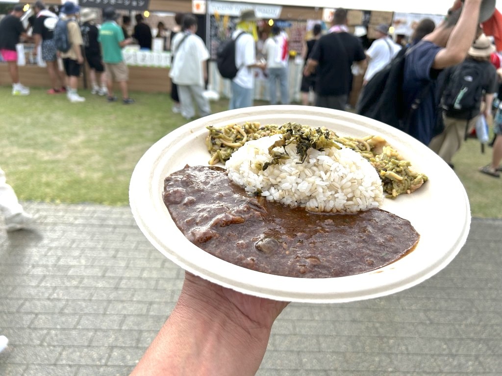 2日間のフェスの間に、ガッツリというほどでもなく、けれど「食べた~」とお腹に溜まるような感覚になれるものを食べたい。そう思いながら、フードエリアを何度も行き来して、決めたのがこれ。鹿カレー、猪とごぼうのあんかけ、茄子麻婆、クレソンそば飯の4つから2つを選べるメニュー。肉よりも野菜に気持ちが行ってしまって、吉川茄子の麻婆とクレソンそば飯を選んだ。この二色丼で900円という金額も手頃感がある。