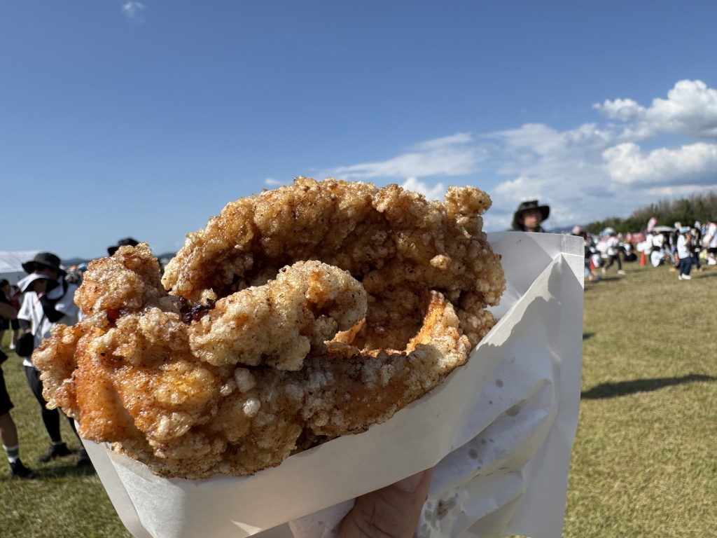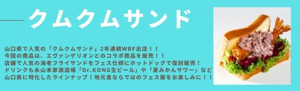 山口はエヴァンゲリオン推しで、今回の出店もエヴァ関連のネーミングをつけていることが多い。このクムクムサンドさんは2回目の出店。今回の商品は、エヴァンゲリオンとのコラボ商品ということで店舗で人気の海老フライサンドをフェス仕様にホットドッグで復刻販売ということ。さて、お味についての第一印象は......何と言っても紫色が目を引くタルタルソースです。こちらは、しば漬けが巧みに入り込んだ独特な風味を持っており、ひと口食べるごとにびっくり。その色合いからまず目を奪われ、その後に広がる味わいもまた格別です。そして、海老フライもまた絶品。海老好きな私としては、ぷりぷりとした食感がたまりません。外はサクサク、中はジューシーで、そのおいしさにびっくり。全体として、とても満足できる一品でした。