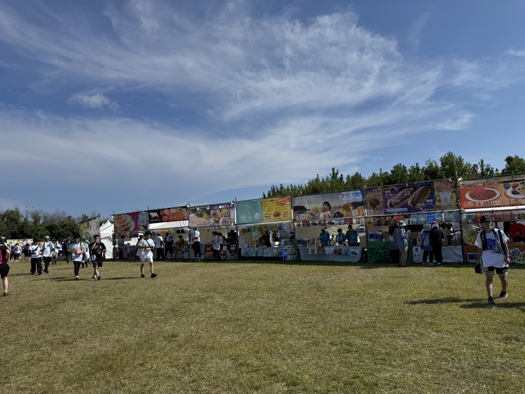 フードエリアが一か所に集約されているので、全部を眺めてから選ぶことも可能。見渡す限りの飲食エリアは圧巻。ただ他のステージ横とかにでもあったり、いろんなところに点在してくれていると、歩いた次にご飯できていいんだけどな。座席数は少な目だけど、どこでも座れるのでシートなどあるといいかも。広場で、上をみあげたら、ゆうゆうと泳ぐクジラやタコの形した雲がみられるかもよ。