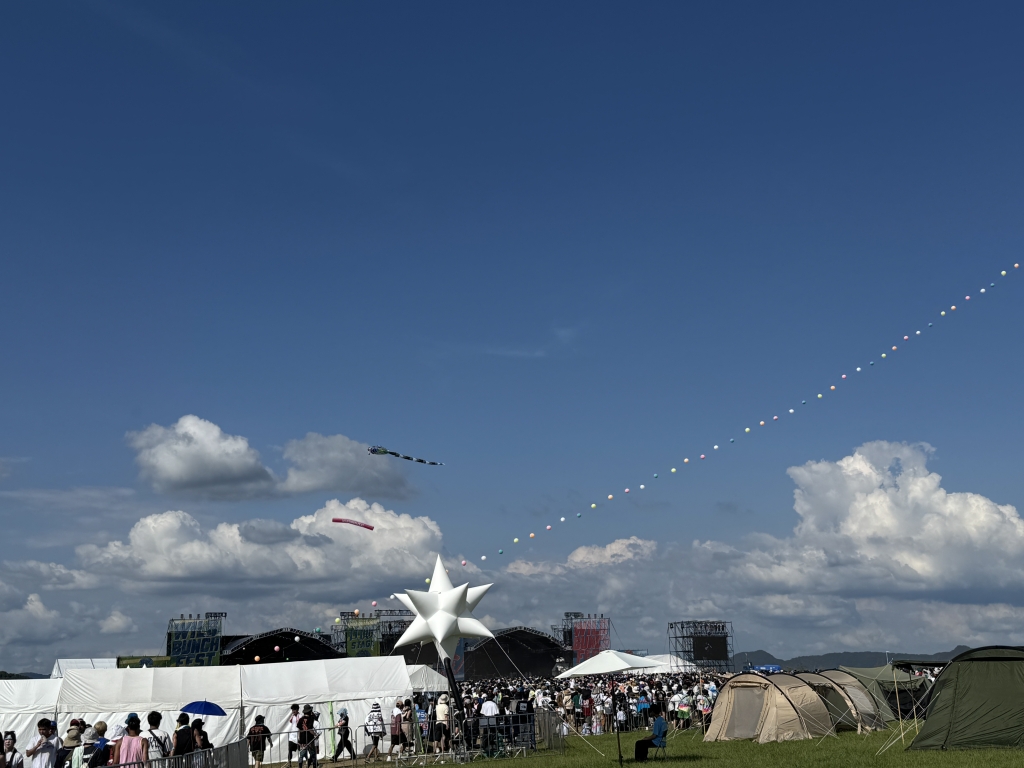 メインステージの後方にはピクニックエリアがあり、小型テントやシートなどを広げることが可能。広大なのでナンバリングタワーというものがあって、待ち合わせなどに使えるよう。さながら羽田空港の時計台みたい。