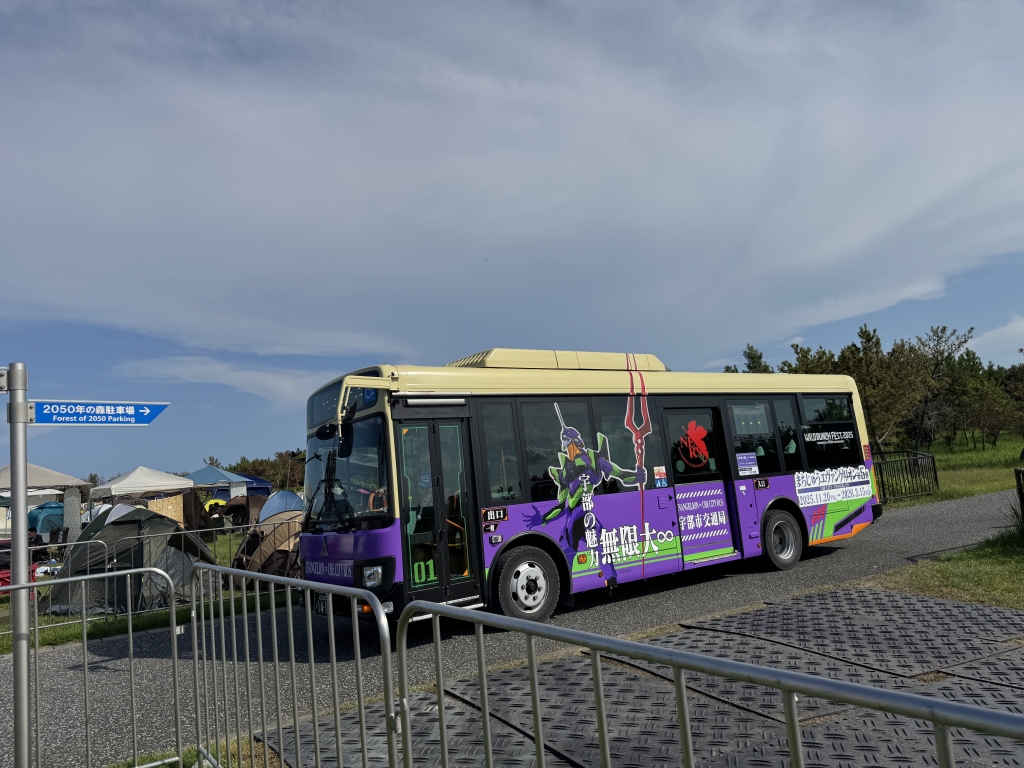 その他には、おもに物販などを行なうドーム棟があるのだかライブ会場との行き来を楽にしてくれるのが、シャトルバスだ。10分おきぐらいに走っているのでちょっと待てば座れる喜び。またバスも今年は「まちじゅうエヴァンゲリオン」企画とコラボしており、エヴァンゲリオンのラッピングバスになっていた(エヴァンゲリオンの作者、庵野秀明は宇部市出身、ラストシーンには宇部新川駅がモデルになって