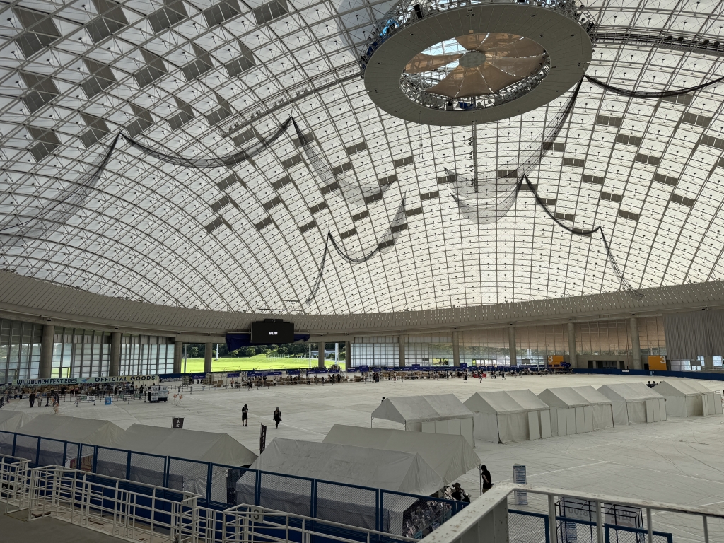 ドーム棟は物販やクロークなどがあり、物販を買うのに室内で並ぶことができるのが魅力。8月末の暑さしのぎや熱中症対策に利用することもおすすめ。スタンドに座ることもできるので、ちょっとのんびりするにはいいかも。