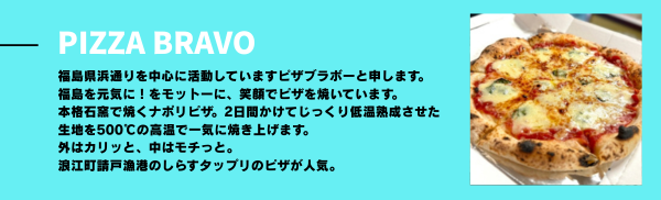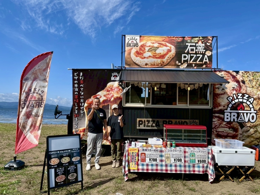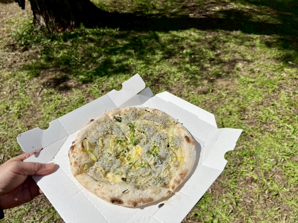 2日間かけて低温熟成させた生地は、キッチンカーに積まれた本格石窯の500度で一気に焼き上げられ、上品なカリモチ食感に。チチニエッリとは、イタリア語で小魚を意味するしらすのピザ。「PIZZA BRAVO」の活動拠点となる福島県の海沿い側、“浜通り”にある浪江町漁港から漁れた釜揚げしらすをどっさりのせガーリックオイルとネギで仕上げた濃厚ピザを、湖畔に腰かけてビールで流し込む。うん、最高。