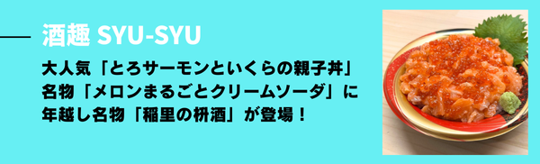 酒趣 SYU-SYUは人気の「とろサーモンといくらの親子丼」や「稲里の枡酒」が今年も登場。ASTRO ARENAでは年越し名物「稲里の枡酒」のお酒を楽しんだ後にお店横のテーブルで枡酒にメッセージやイラストを書く事ができます。推しバンドへの思いを刻んだら、来年も増す増すフェス福が舞い込んでくるかも!?