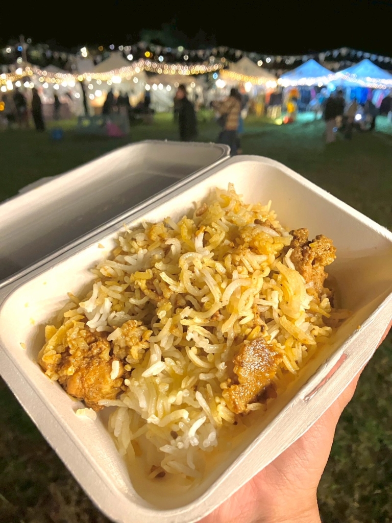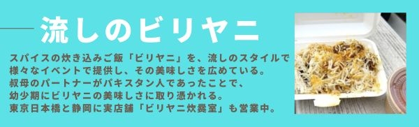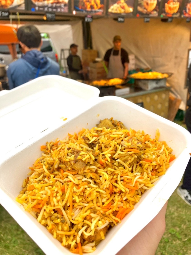 RAINBOW STAGE横で出会ったインパクトのある店名「流しのビリヤニ」。南インドのビリヤニの街「ハイデラバード」のチキンビリヤニを、現地のような大鍋で1回100食分を一気に炊き上げているとのこと。辛いのが苦手だけど、食べてみるとそこまで辛くはなく、どことなく懐かしい味わい。ごろっとチキンがボリューミーで満足度高め。辛いのが苦手な私でも美味しくいただけるビリヤニでした。