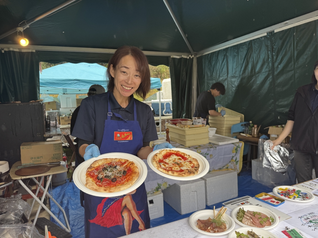 地元 静岡県沼津市のナポリピッツァ専門店で、朝霧JAMには今年で2度目の出店です。厳選小麦と水、塩、酵母のみを使って自然の力だけで長時間発酵させて生地の準備を行い、地元食材を中心に具をたっぷり乗せて、超高温の窯で一気に焼き上げているとのこと。