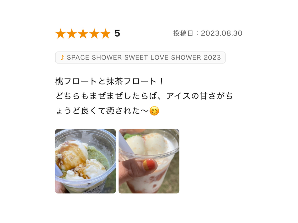 お店の看板やフェスのホームページで見るメニュー写真だけではどれが美味しいのかな?と思ったりもする。そんな時に実際のレビューを見ると、数あるご飯やスイーツの中でもリアルな美味しいごはん情報に出会える。思い出に残るフェス飯だからこそ、やっぱり美味しいご飯を食べたい時に便利だ!