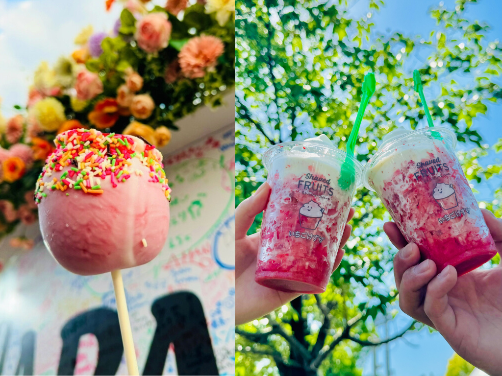 個人的に好きなのは、スイーツ系の情報である。かぶりつきたくなるような肉、ジャンクな丼ぶり飯など、スタミナ料理が並ぶ中、涼し気なスイーツや甘々な見た目のドリンクは私の心をわしづかみにする。派手で鮮やかな見た目のものも多いので、まさにインスタ映えを狙えそうなビジュアルである。写真左のような見た目が面白いりんご飴や、写真右のような清涼感のある人気のいちごけずり®も、フェスで記念に一枚撮っておきたくなる。