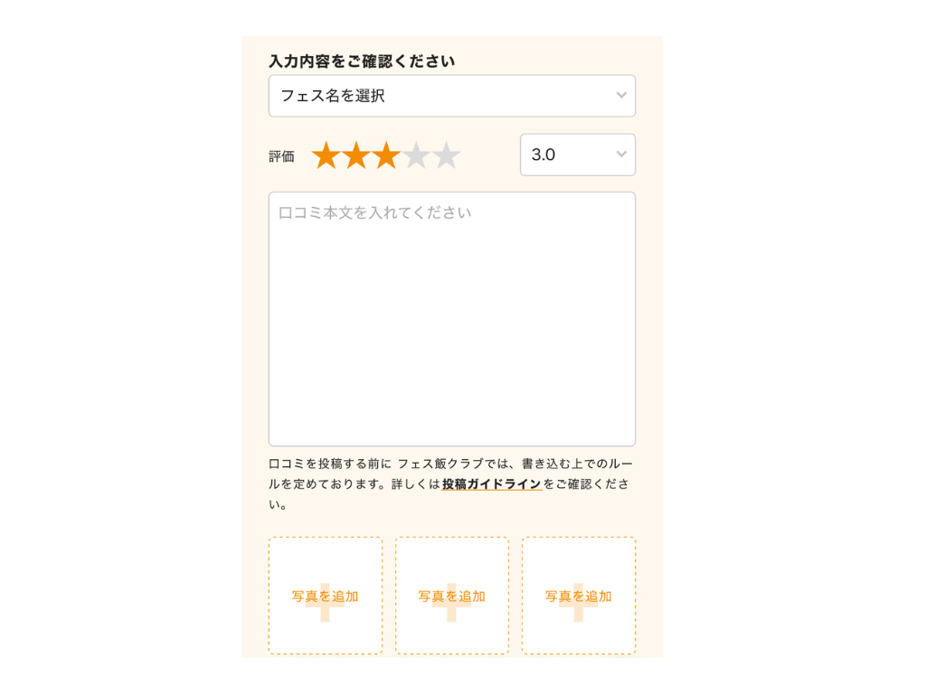 そして、“レビュー”。これが、実際に自分が食べたフェス飯を口コミとして投稿できる機能なのだ。個人的に活用したいと思ったのが、“レビュー”である。もはや、これはフェスの記録として最適ではないだろうか?行ったフェスが記録できる。食べたフェス飯が写真で残る。感想をその場で書ける(なんならちょっと雑でも良い)。それを見た人が参考にフェス飯を楽しむ……。同じ趣味を持つ人が繋がるツールとして好循環すぎではないか、とすら思う。