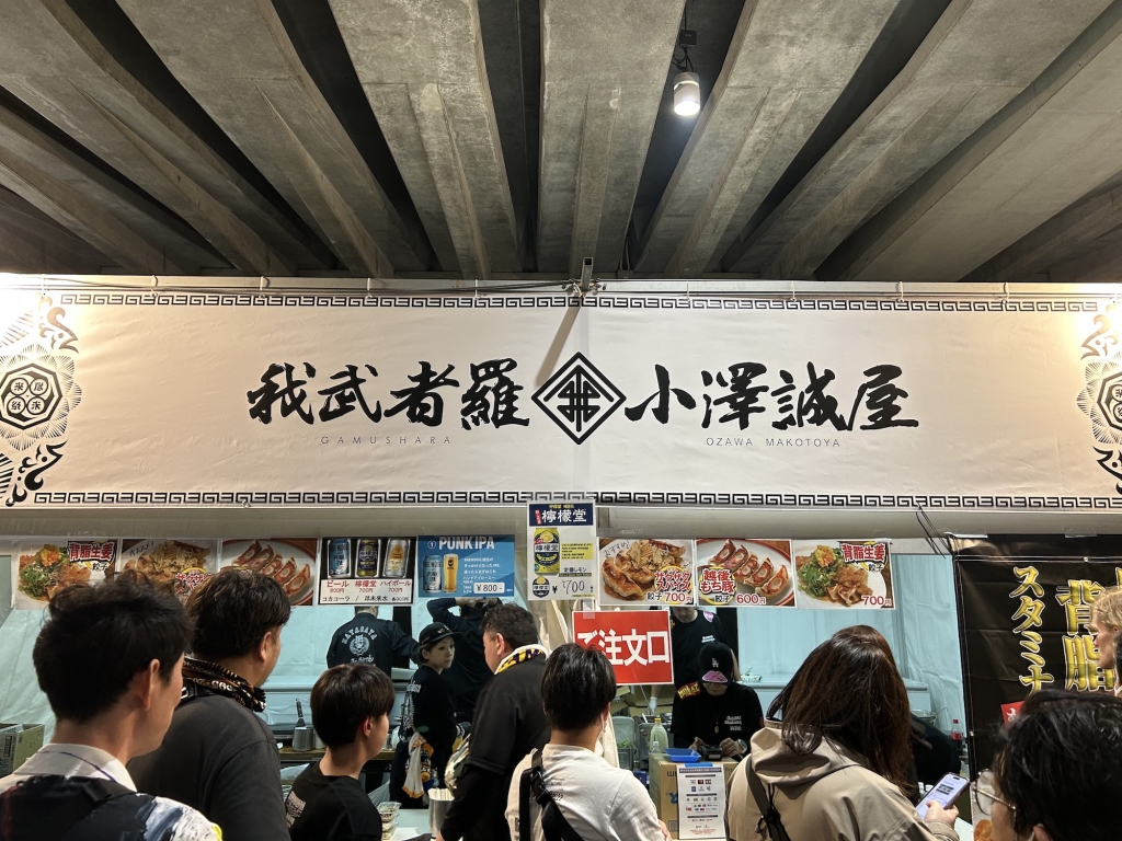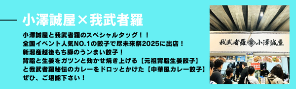 東京で30年店を構える「百麺・誠屋」とBRAHMANのベーシストMAKOTOがニューアコで出店しているラーメン屋が「小澤誠屋」。尽未来祭では、さらに新潟Loveなラーメン屋「我武者羅」とのトリプルコラボが実現した。