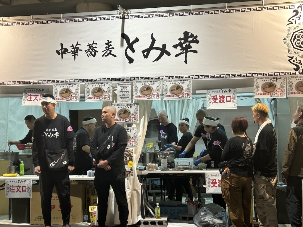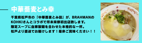 千葉県松戸市にある大人気店の「中華蕎麦とみ田」とBRAHMANのギタリストのKOHKIのコラボが「中華蕎麦とみ幸」。松戸のお店にはない「とみ田」のラーメンを食べられるとあって、ニューアコでも長蛇の列になっている。