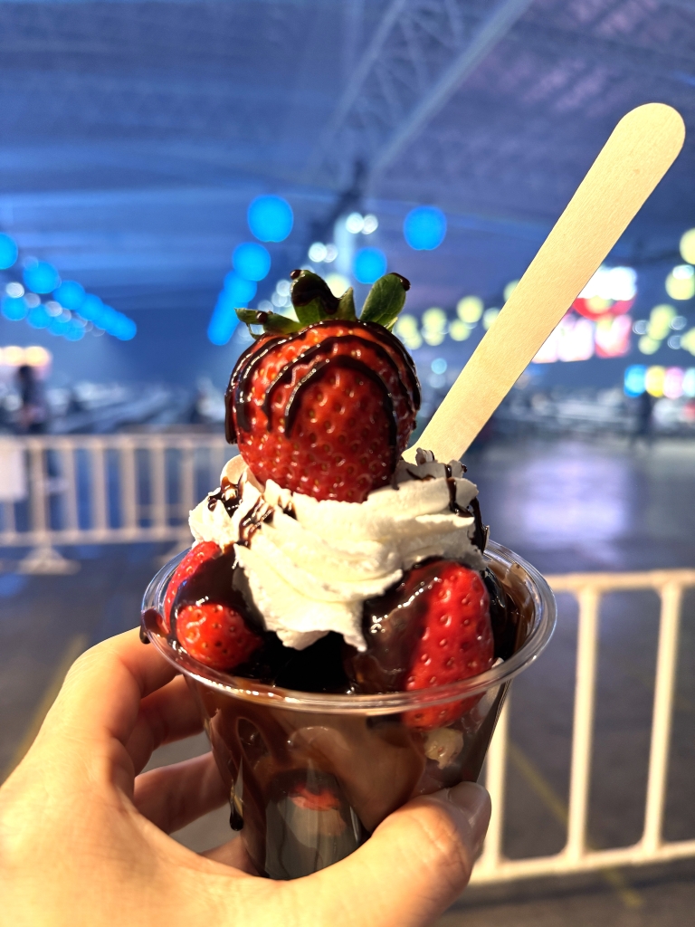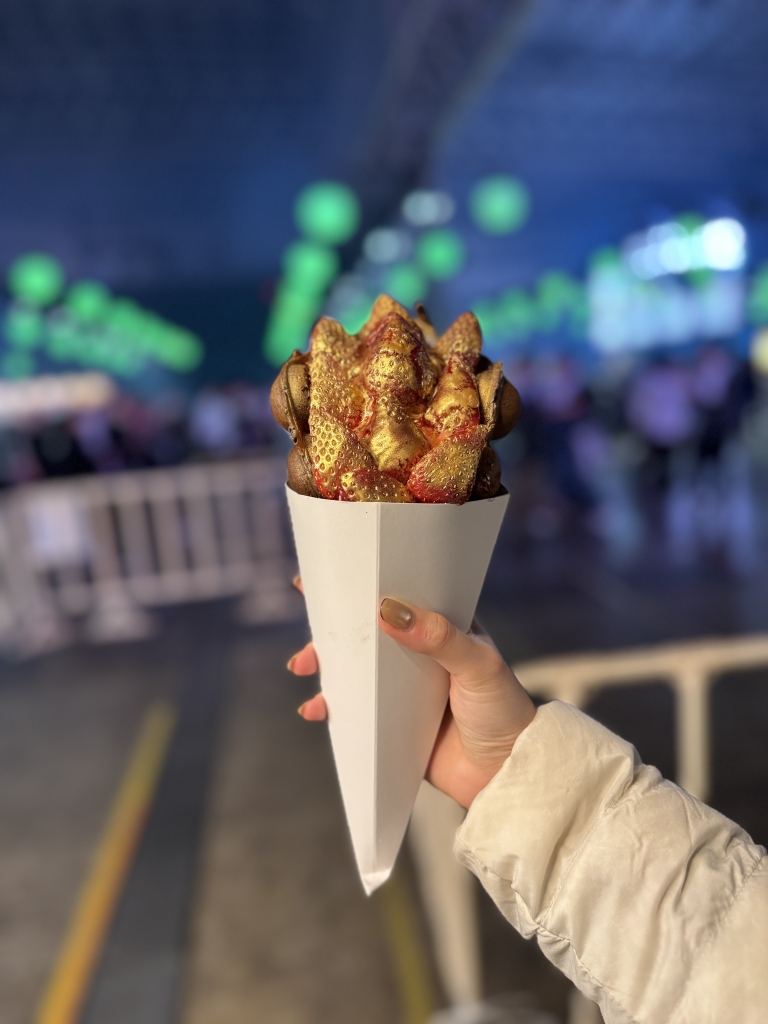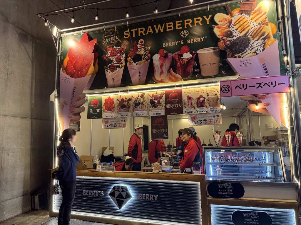 会場でお客さんが持っていたボリューミーなスイーツに目が止まる。 以前、JAPAN JAM 2025 に出店していた、人気のいちごスイーツのお店「ベリーズベリー」の「ストロベリーバブルワッフル」だ。なんとCOUNTDOWN JAPAN 25/26 には初参加。栃木県のいちご農家さんとあり、お店のウリはもちろんいちごをふんだんに使ったメニュー。ということで、いちごやワッフルの美味しさを追求する「ベリーズベリー」の福田さんに今回はお話をお伺いしました。