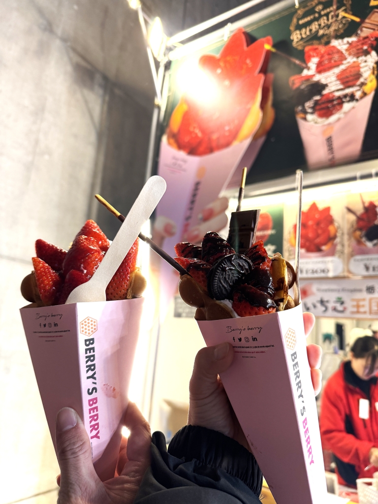 ストロベリーバブルワッフルとチョコイチゴバブルワッフル、これで1200円って絶対安いと思う。さすが、いちご農家だからできる値段設定。