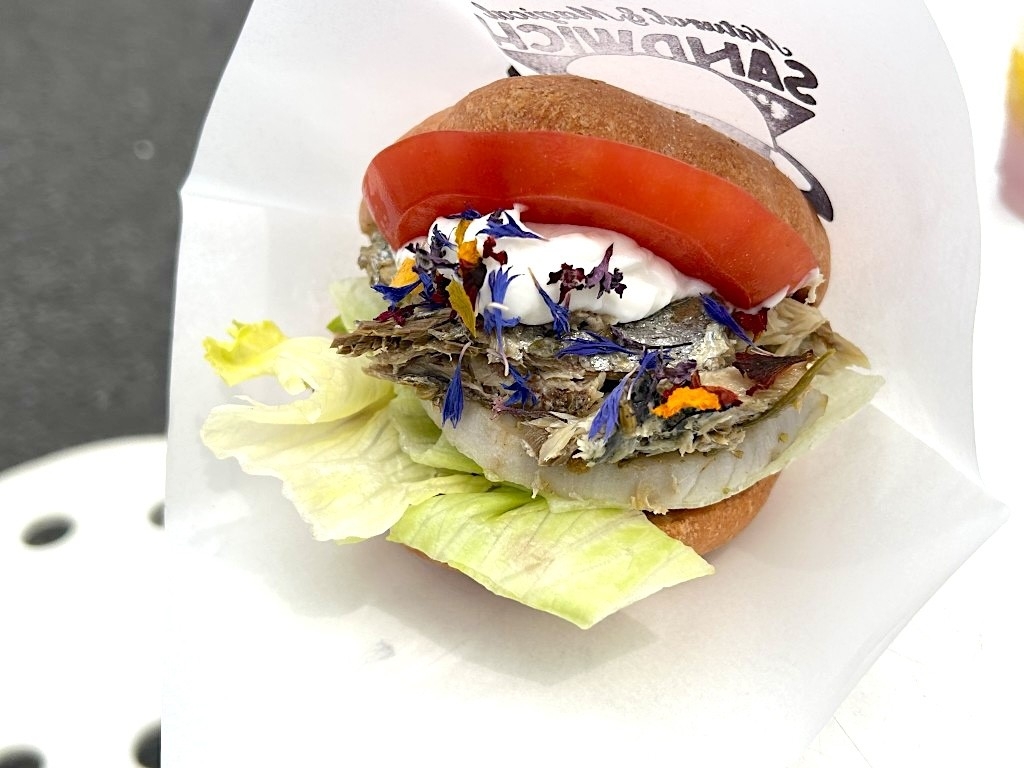 TSUKIMO BAZAAR 「いわしのコンフィ&エディブルフラワーヨーグルトソースバーガー」