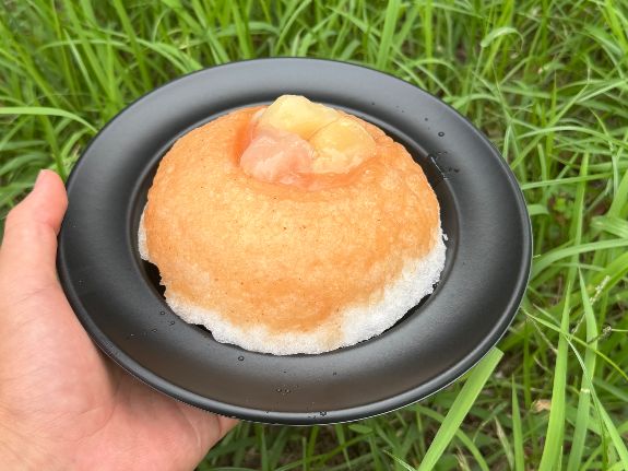暑い日にピッタリのかき氷の上に、白桃の果肉がゴロゴロのっていました!