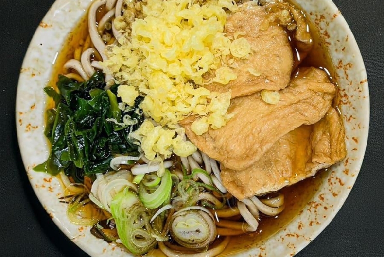 盛盛特製のオリジナルブレンドで炊く1番出汁を秘伝の生返しで割り、キリっとした醤油のキレと豊かな風味のつゆには、お揚げ+揚げ玉の相性が抜群。 甘く煮込んだお揚げが食欲を誘う逸品です。