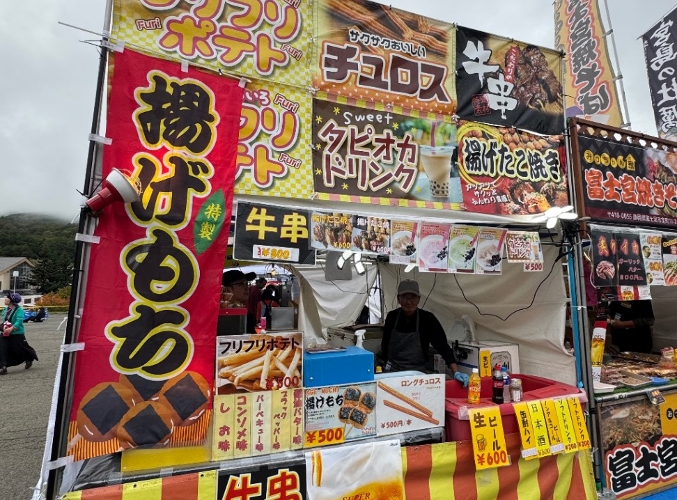 牛串、揚げたこ焼き、揚げ餅、いちごミルクを販売します