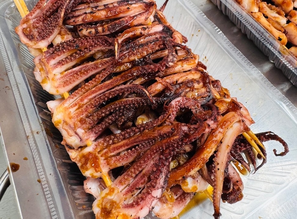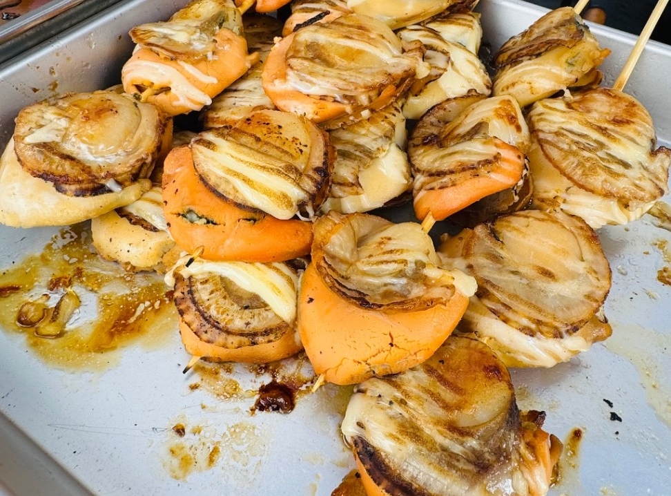 ラム串、鉄板焼きイカ、イカのゲソ、ホタテ、エビを販売します