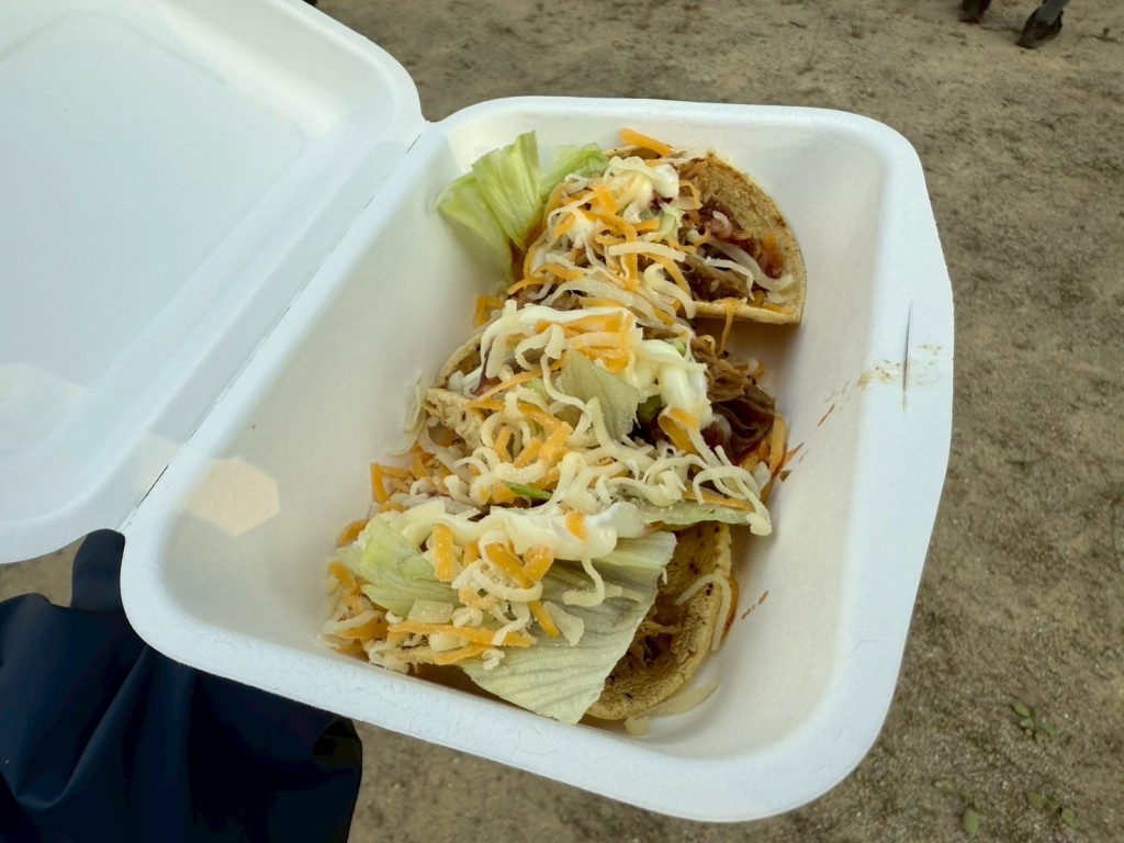 辛さゼロをチョイス。辛さが無くてもバーベキュー味が濃厚でおいしい。しっかりと予めタコスも包まれていて柔らかすぎないソフトシェル、片手で食べやすい。味付けもくどくなく、ぺろっと食べれました。 辛いのが好きな方は、スパイシーなタコスにハラペーニョを追加するのもいいかも。タコスというと丸い平皿に並べられてるイメージだけど、野外フェスで蓋付きタイプの容器なのはうれしいポイント。