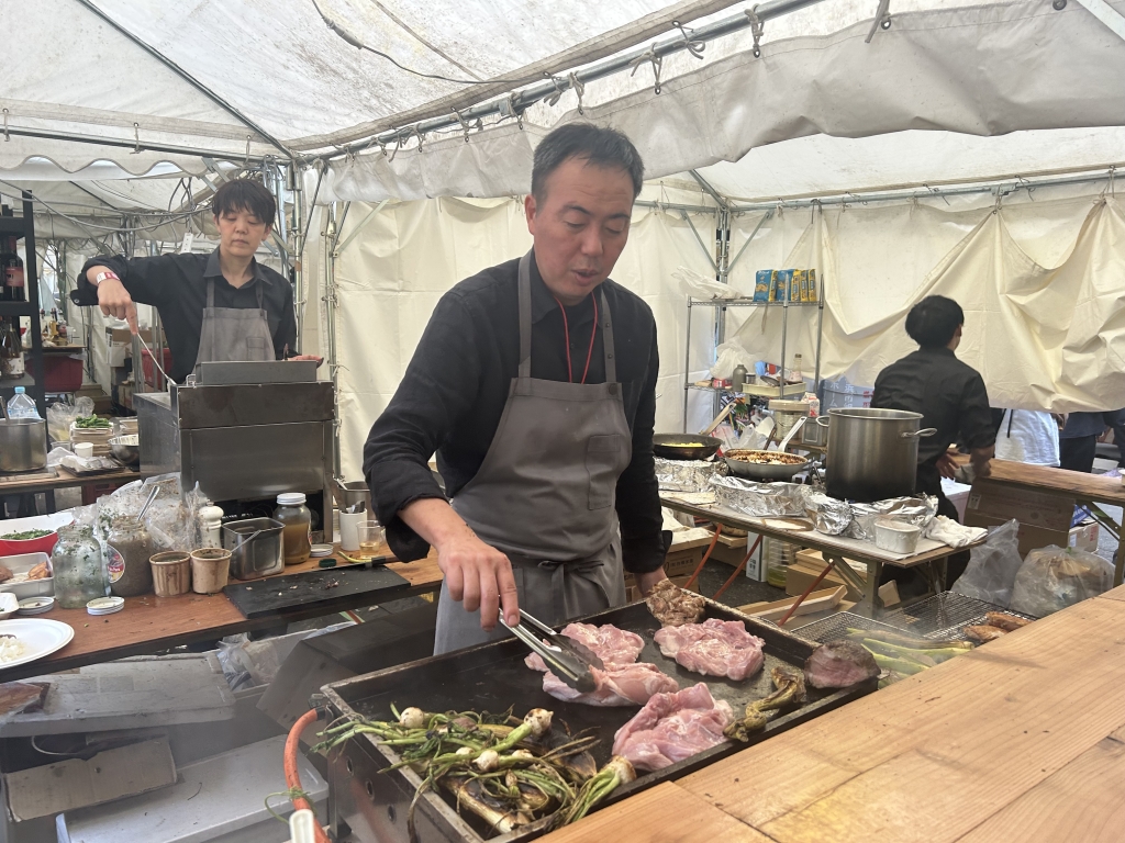 黒板に「今日の調理」が掲げられるシンプルズ。予約がなかなか取れないイノベーティブ・フュージョン料理のレストランだという。静岡市の里山にあるお店では、ランチ、ディナーもコースのみで提供されていて、いずれも1万5千円から。そんな人気レストランが、FRUEには初回から欠かさずに出店している。