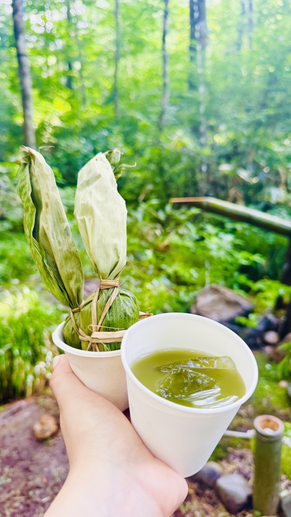 「だんご屋」の笹団子の特徴は、蒸し練り杵つき製法で作られる生地にあります。切り餅の製造時に出た端材をあえて使用し、上新粉やよもぎとともに蒸練機で蒸しながら練ることで、しっとりと柔らかく、コシのある食感に仕上げられています。もちもちの生地と北海道産小豆の餡が合わさり、緑あふれる森の中でクールダウンしながら、ほっと一息つくのが最高のひとときでした。