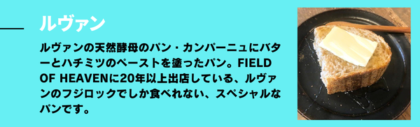 数ある商品の中でも、「ルヴァン」といえばやはりカンパーニュ。ずっしりとした生地で、かむほどに小麦の風味が広がります。全粒粉を使っているため腹持ちもよく、天然酵母ならではのやさしい味わいも魅力です。以前亭主にお話をお伺いした際は、朝に焼き上げたパンをそのまま会場へ直送していると話していました。その言葉どおり、焼きたての旨みが感じられる一品として印象に残っています。