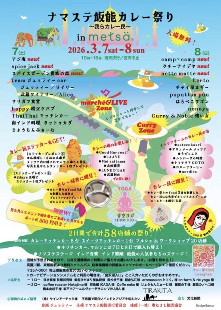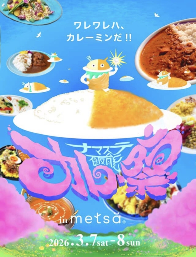3月7日(土)~3月8日(日)の2日間、「metsä(メッツァ)」にて『ナマステ飯能カレー祭り~我らカレー民~ in メッツァ』を開催♪ 会場にはカレーキッチンカーの他にも、スイーツやマルシェ、ワークショップなどのお楽しみ要素が目白押し!開催直前という事で、注目ポイントと出店予定のオススメ店をご紹介したいと思います。