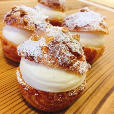 地食健身をモットーに、富士山麓の素材を活かしたお菓子を作っています。主に朝霧高原で取れた牛乳と放し飼いの卵です。朝霧の牛乳の特徴はコクがあるのにさっぱりと飲みやすく、カスタードクリームに適しています。卵は放し飼いのため鶏にストレスがないので、味も濃くしっかりとしています。それを使ったシュークリームを是非!