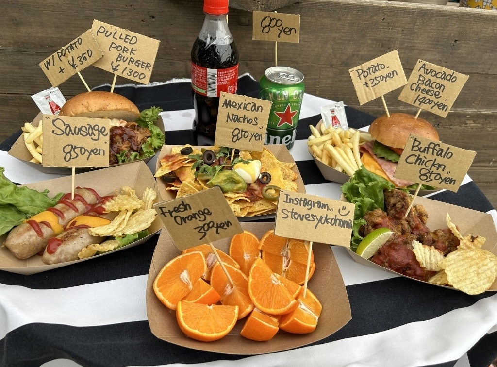 グリーンルーム、ローカルグリーンにも初回から出店。チーズバーガーやアボカドバーガー、ナチョスにバッファローチキンなどを販売します。